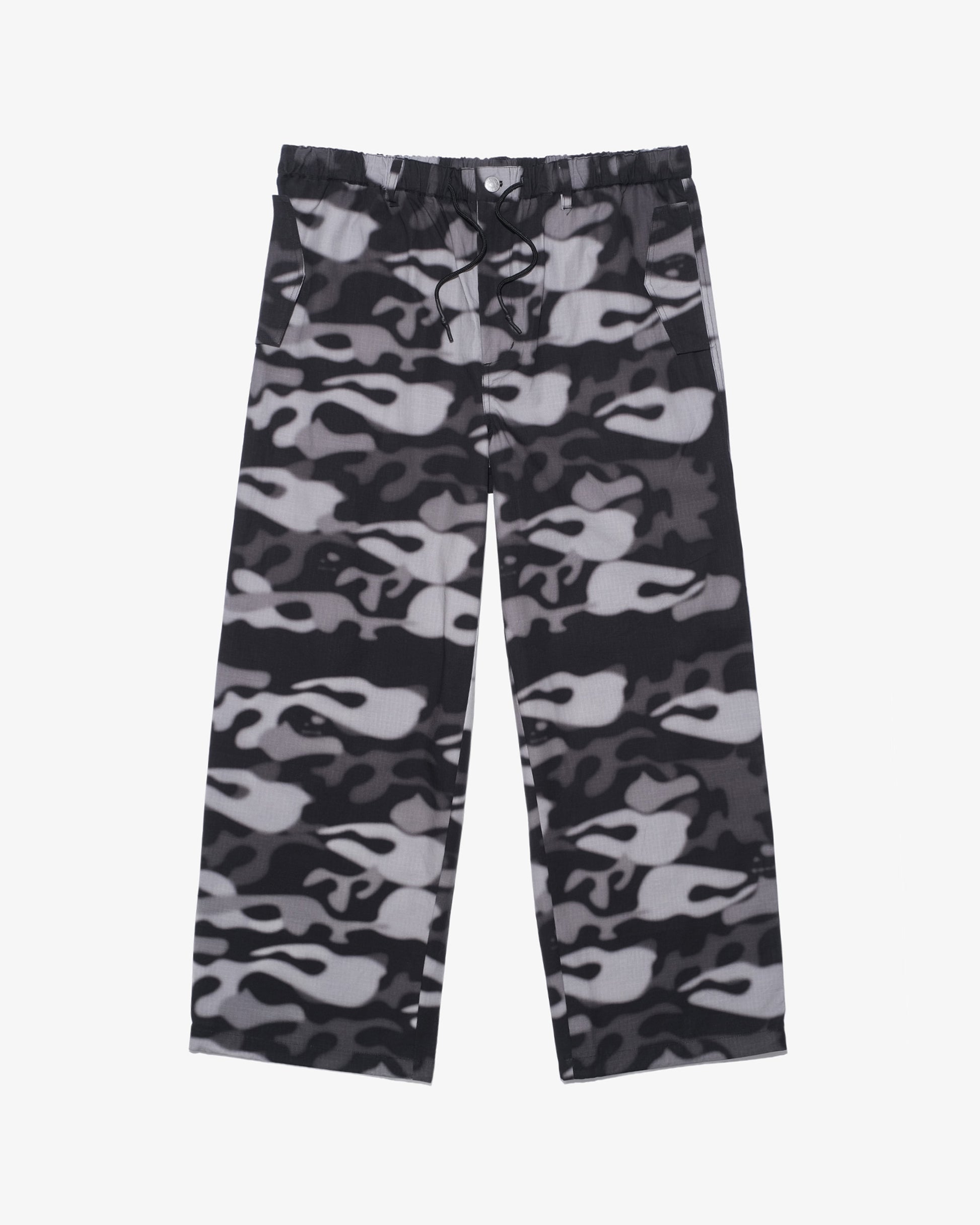 コットンリップストップを採用した ワイドパンツ。SNOW CAMO PANTSをベースに裾幅、ワタリに大きなゆとりを持たせたシルエットが特徴。オリジナルタックボタンを仕様。