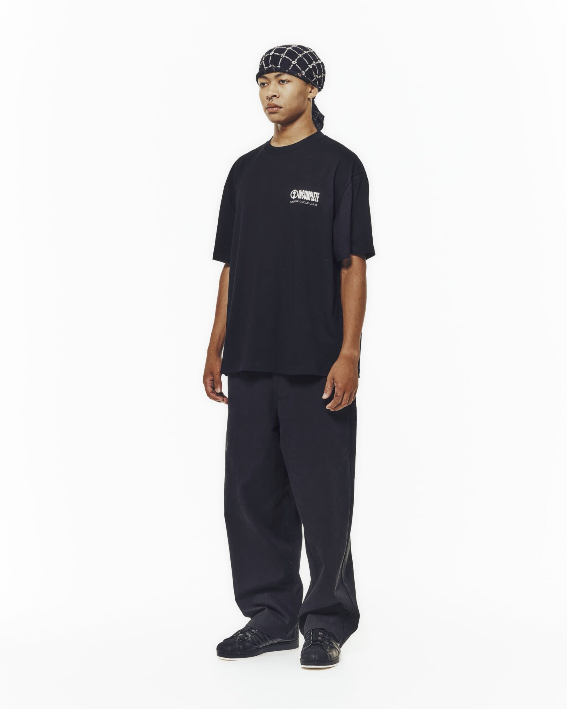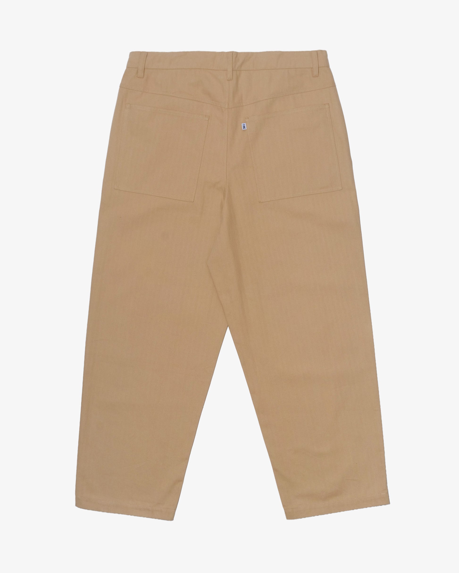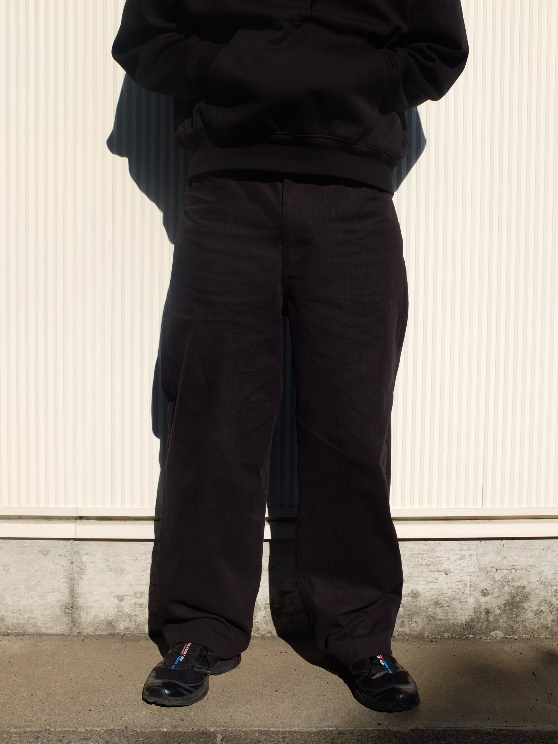 肉厚で耐久性に優れたヘリンボーン生地を使用したバギーパンツ。 深めに設定した股上と、ゆとりを持たせたワイドな裾幅が特徴。 太いシルエットを維持しながら、素材特有のハリを活かした無骨なラインを形成する。 タフな仕様とクラシックなディティールを両立した一着。