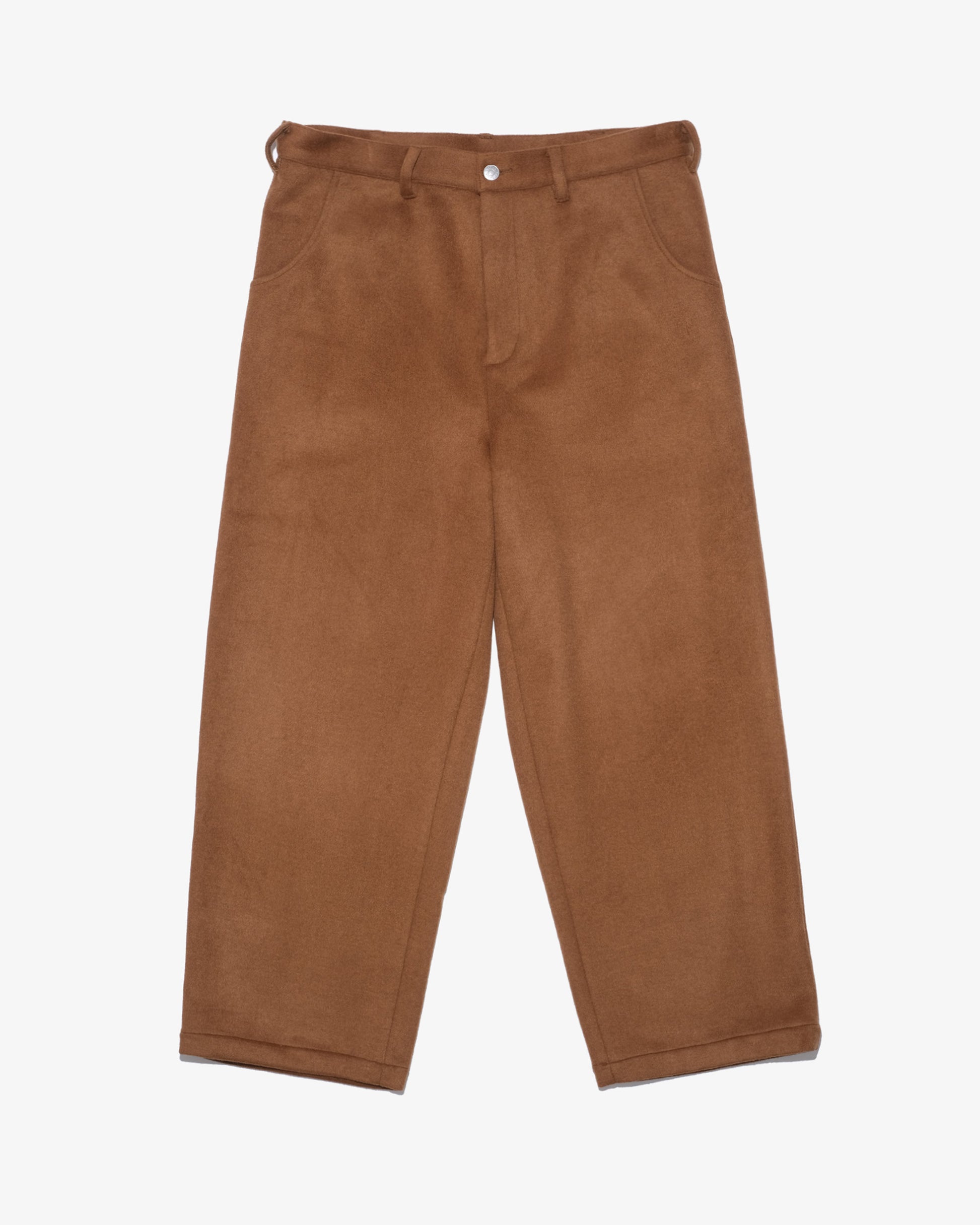 毛足の長いウール棍の生地を採用したバギーパンツ。独特の光沢が特徴。オリジナルタックボタンを仕様
